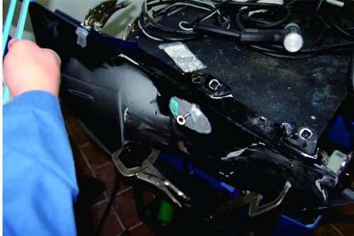 在鋁質(zhì)面板修復(fù)時(shí),也可使用鋁整形機(jī)對損傷部位進(jìn)行拉伸修復(fù),在經(jīng)整形機(jī)修復(fù)到位后,使用專用工具將螺紋介子齊根剪下,再打磨平整即可。對于鋼板車身來說,當(dāng)面板和內(nèi)層結(jié)構(gòu)同時(shí)發(fā)生變形時(shí),可以采取內(nèi)外層分離、分別修整,然后折邊咬合的修復(fù)方法。對于鋁質(zhì)面板,不能使用這種方法,否則由于鋁的韌度較差,折邊部位會(huì)出現(xiàn)裂紋或斷裂。
