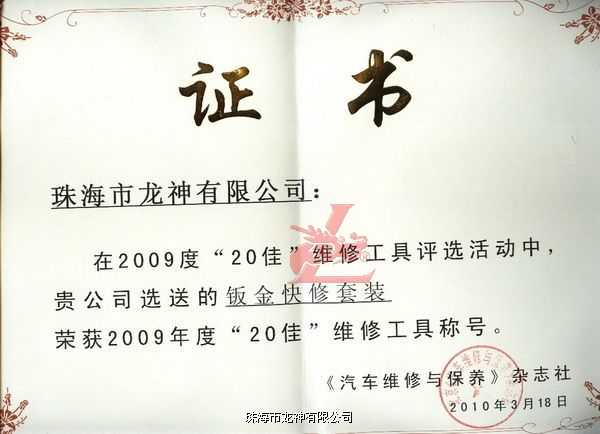 2010年北京汽保春季展期間,由中國汽車保修設(shè)備行業(yè)協(xié)會和《汽車維修與保養(yǎng)》雜志共同舉辦的2009年度“20佳”維修工具頒獎典禮,于2010年3月18日在北京江河水鳥巢麗景隆重舉行,龍神“鈑金快修套裝”在眾多候選產(chǎn)品中脫穎而出,獲得本屆評審委員會專業(yè)評委的一致認(rèn)可:符合產(chǎn)品創(chuàng)新性、實用性、效率性,可幫助企業(yè)提高工作效率,授予“中國汽車維修市場2009年度20佳”榮譽(yù)稱號。