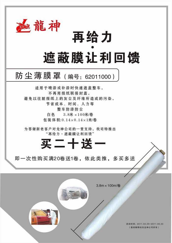 2011年4月再給力·遮蔽膜讓利回饋促銷! 2011年4月再給力·遮蔽膜讓利回饋促銷! (活動已結(jié)束,感謝您的關(guān)注) 一、活動主題: “再給力,遮蔽膜讓利回饋” 二、活動時間: 1、時間:2011年04月20日至2011年06月20日 2、時長:共計2個月 三、促銷產(chǎn)品: 防塵薄膜罩 尺寸3.8米*100米/卷 龍神編號:62011000 買20送1 ,一次性購買滿20卷送1卷,如此類推,多買多送。 2011-04-19 12263