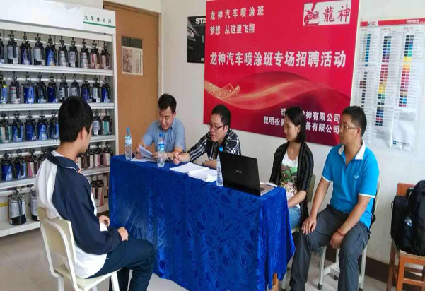 珠海龍神有限公司攜手昆明松騁汽修設(shè)備有限公司與昆明市官渡區(qū)職業(yè)高級(jí)中學(xué)建立更深層次的校企合作關(guān)系,開(kāi)辦龍神噴涂班。現(xiàn)場(chǎng)選拔面試會(huì)已于2014年6月24日在昆明市官渡區(qū)職業(yè)高級(jí)中學(xué)隆重舉行!
